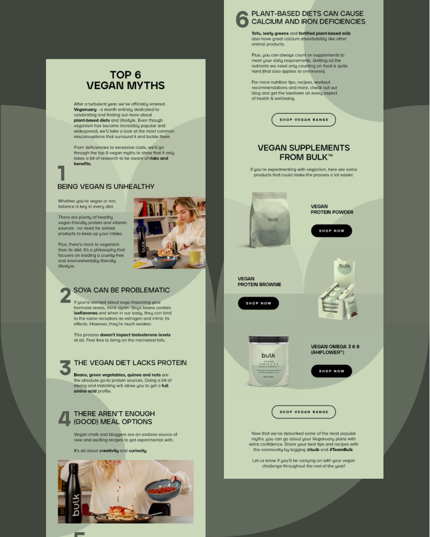 Alongside email, I contributed to ongoing UX improvements across the site, supporting Bulk’s wider goal of building a global community around world-class nutrition. This meant balancing brand storytelling, usability, and performance to positively influence key commercial metrics.