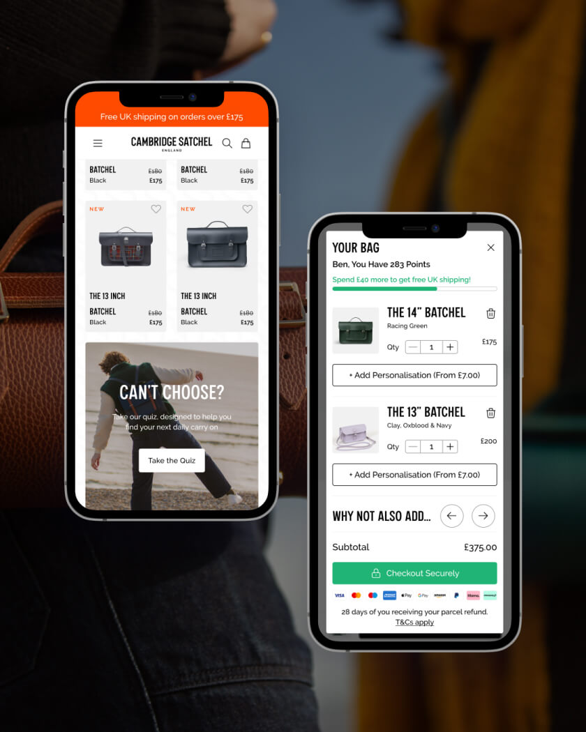 The challenge was to balance luxury brand storytelling with commercial performance. The new experience needed to feel refined and editorial, while remaining fast, intuitive, and scalable within Shopify Plus. Working closely with the Cambridge Satchel and Charle teams, I designed both desktop and mobile journeys, carefully considering every customer touchpoint.