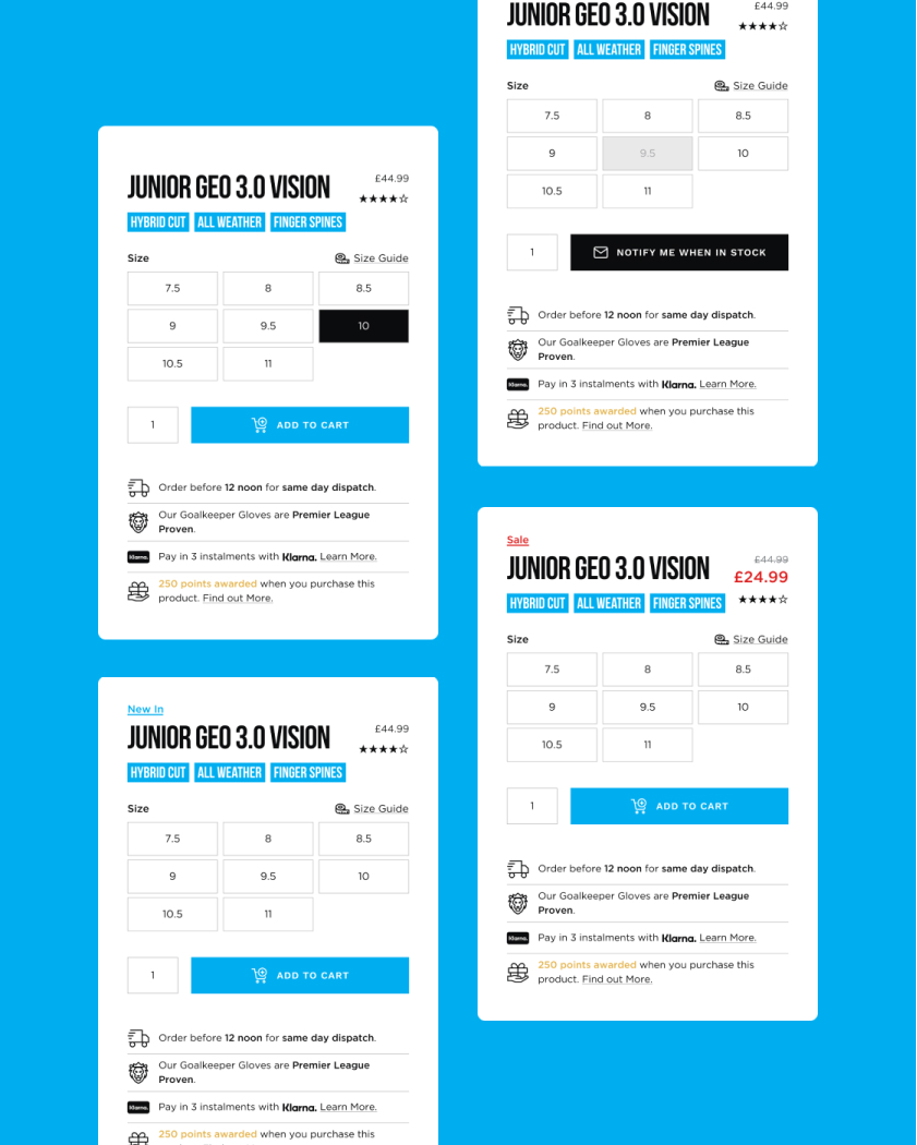 Beyond core shopping flows, we identified opportunities to deepen engagement and retention through new supporting pages. I designed a highly engaging Rewards page with a retro-inspired art direction, alongside Partners and Pros pages to showcase Premier League athletes, brand partnerships, and events — reinforcing credibility, trust, and community around the brand. Significant time was also spent improving PDP structure to better communicate value and increase conversion.